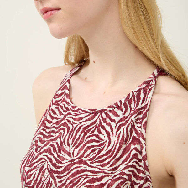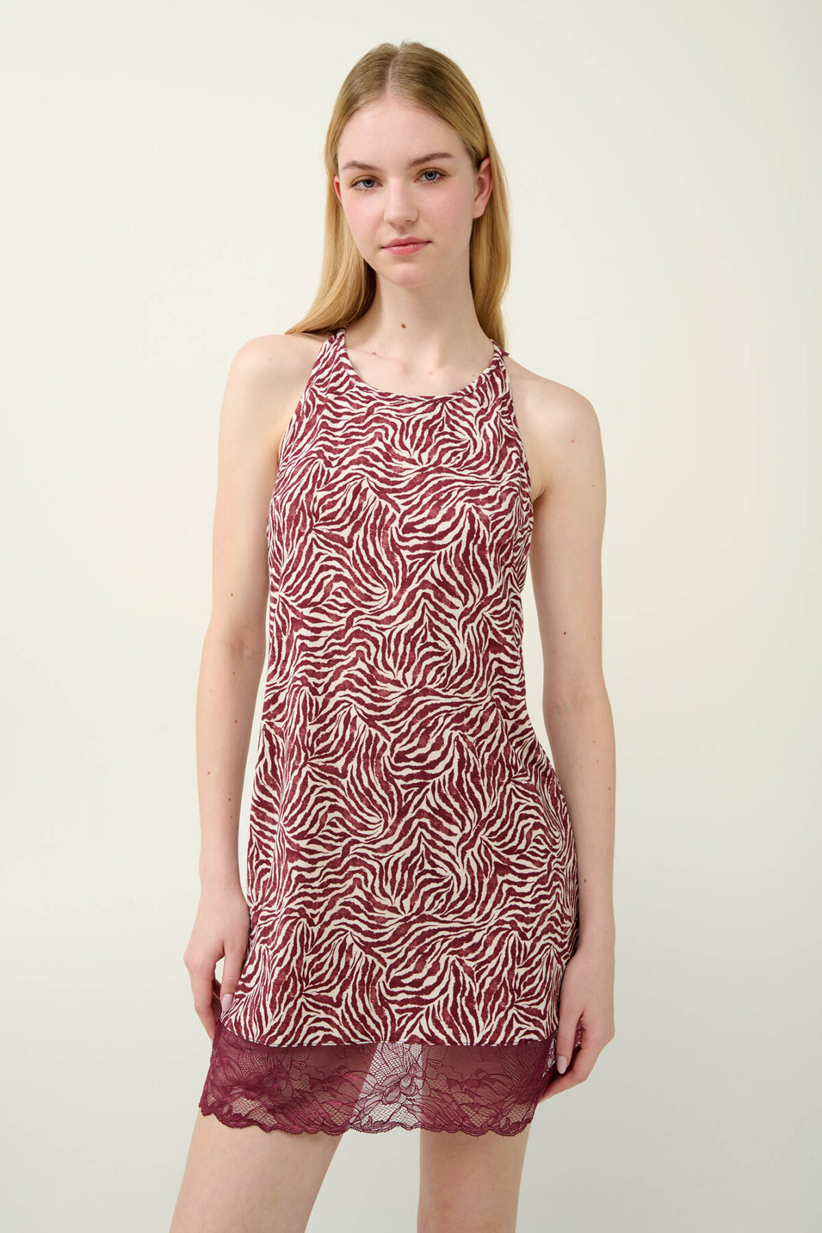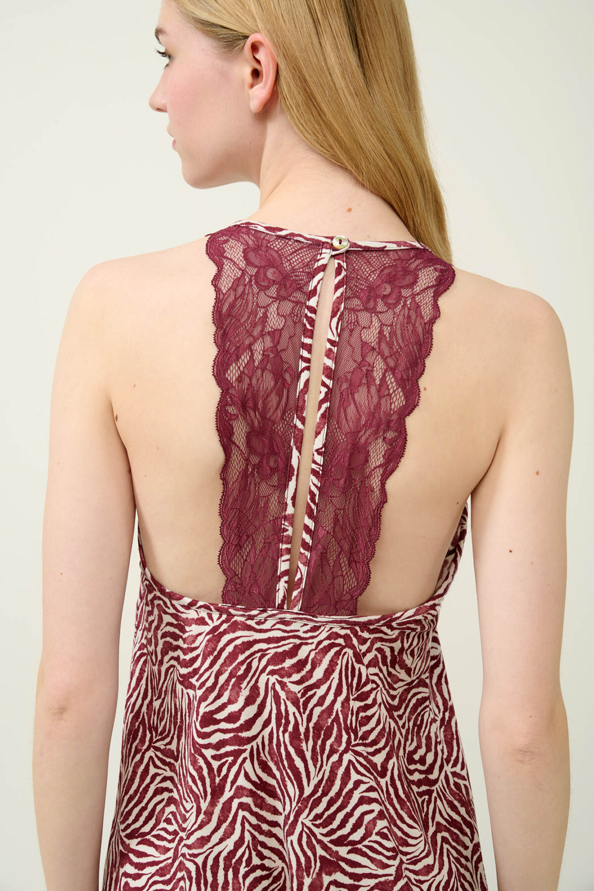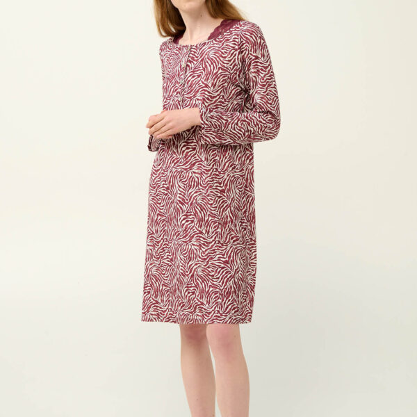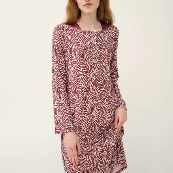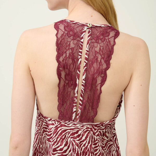 Αφεθείτε στην κομψότητα που σας προσφέρει αυτό το γοητευτικό νυχτικό με ζέβρα μοτίβο σε μπορντό και λευκές αποχρώσεις. Σχεδιασμένο με ανοιχτή πλάτη, διακοσμημένη με δαντέλα που κουμπώνει ψηλά στο λαιμό και δαντέλα στο κάτω μέρος είναι μια εξαιρετικά ρομαντική επιλογή που θα αναδείξει τη θηλυκότητα σας. Κατασκευασμένο από απαλό Lenzing Tencel Modal Micro που αγκαλιάζει ευχάριστα το σώμα θα σας βοηθήσει να απολαύσετε μοναδικές στιγμές χαλάρωσης.